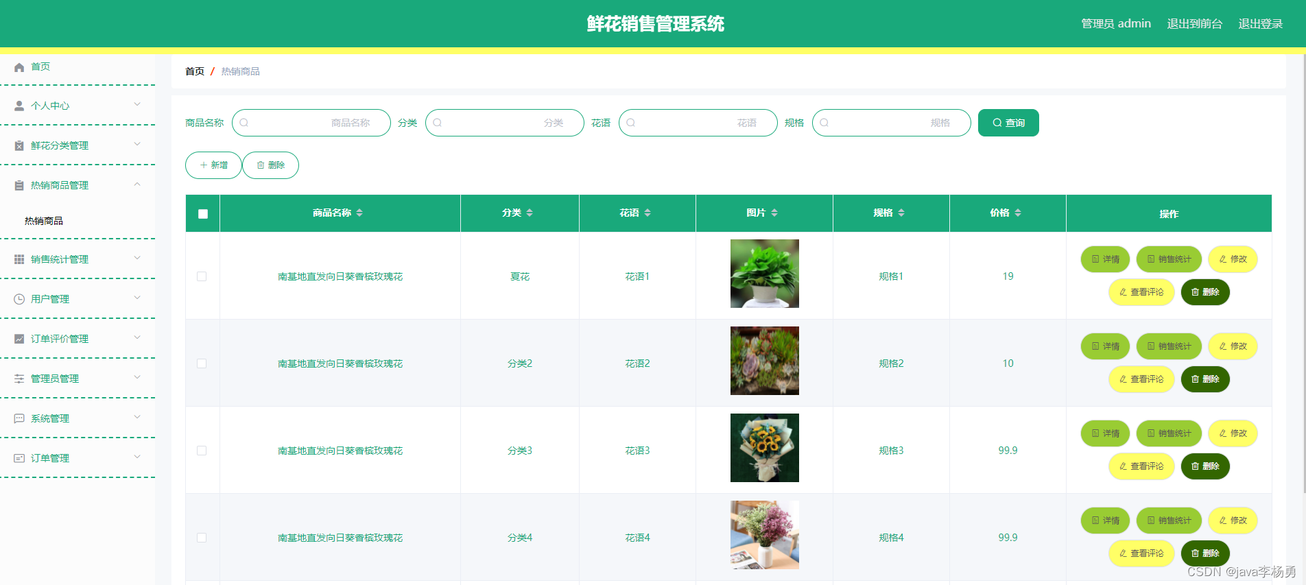 热销鲜花商品: 管理员在热销商品管理页面可以查看商品名称、分类、花语、图片、规格、价格等信息,并可根据需要对热销商品管理进行详情,删除或查看详细内容等操作