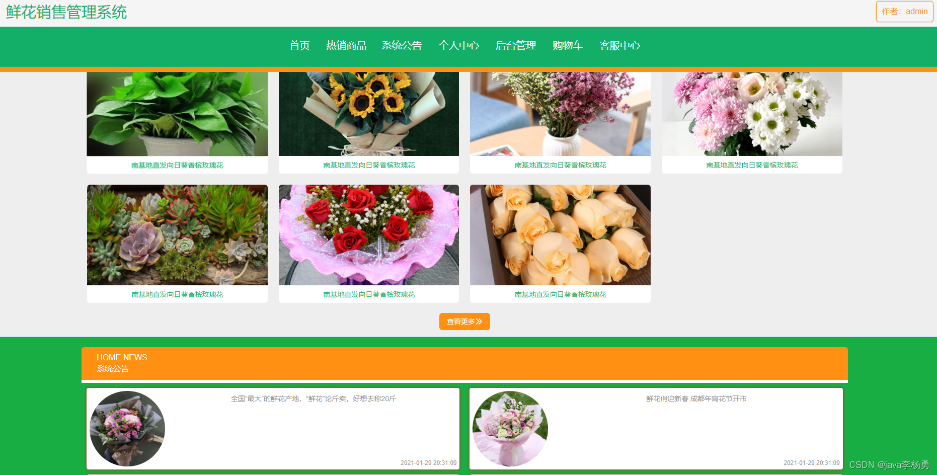 系统主页: 在鲜花销售管理系统可以查看首页、热销商品、系统公告、个人中心、后台管理、购物车、客服中心等内容。