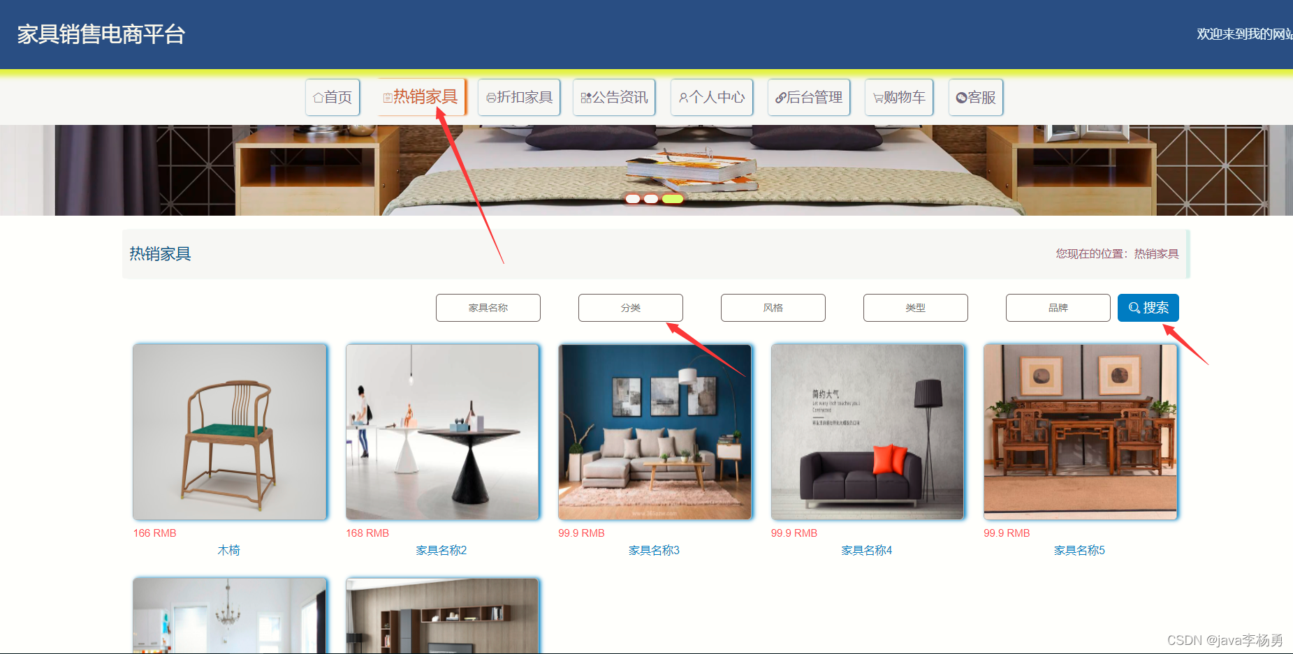 系统网站首页:在系统首页可以查看首页、热销家具、折扣家具、公告资讯、个人中心、后台管理、购物车、客服等内容