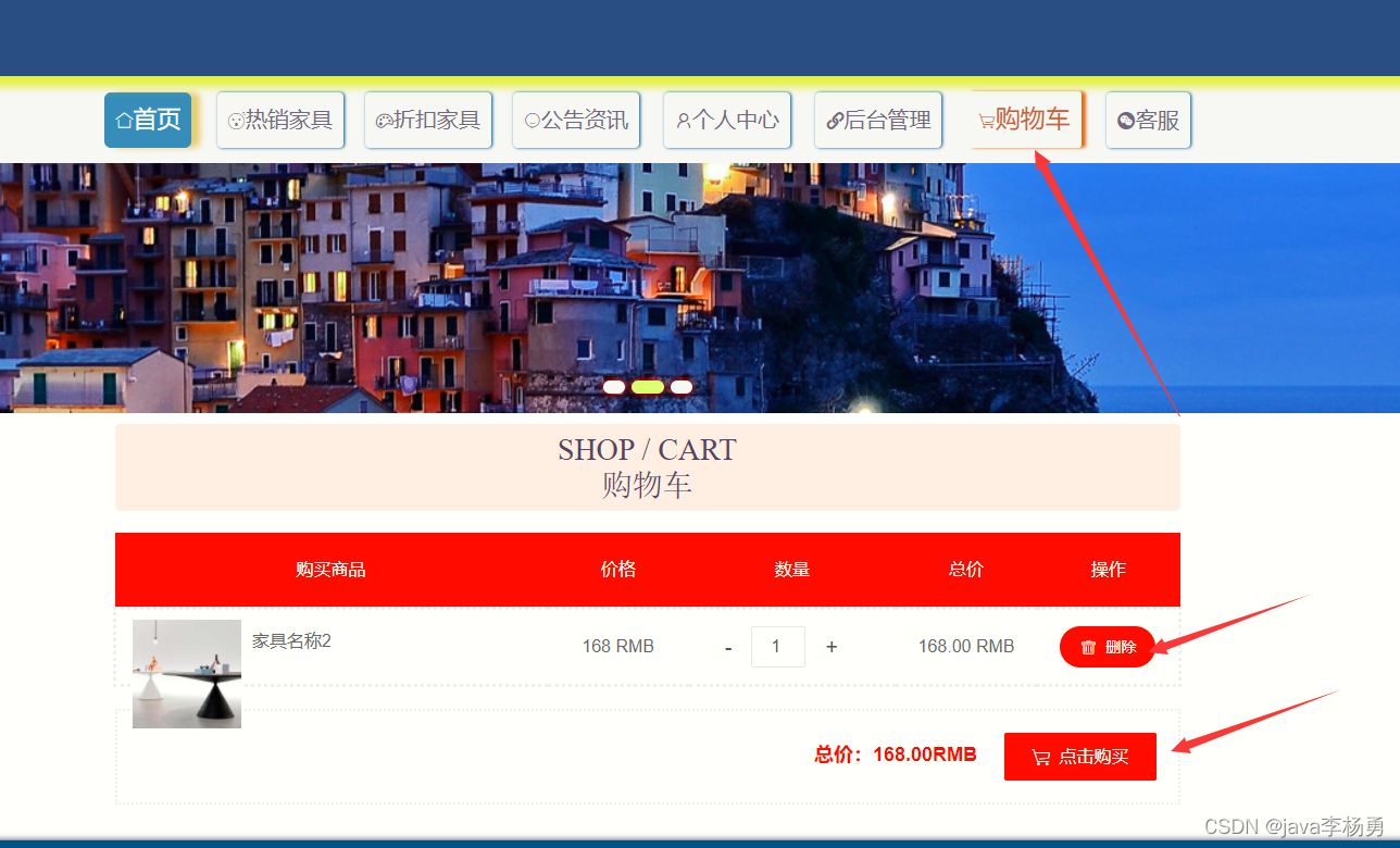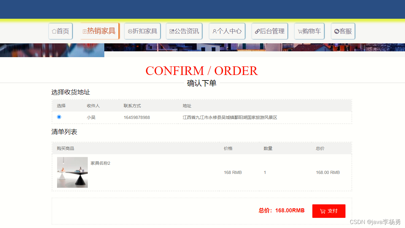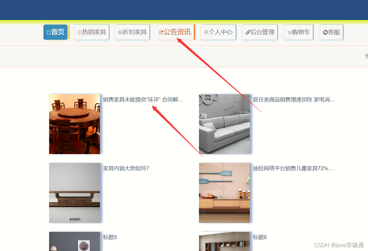 4、前台首页:首页、热销家具、折扣家具、公告资讯、个人中心、后台管理、购物车、客服等相应操作;