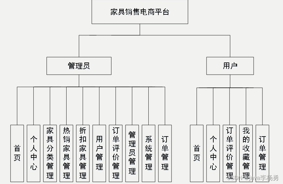家具销售电商平台,主要包括管理员、用户二个权限角色,对于用户角色不同,所使用的功能模块相应不同。本家具销售电商平台结构,如下图所示。