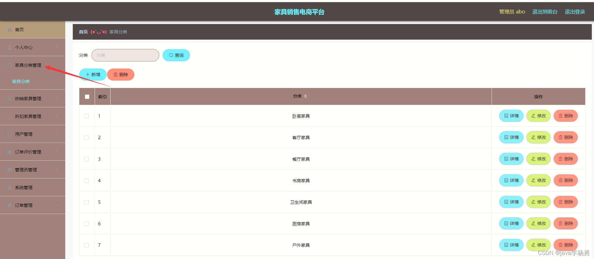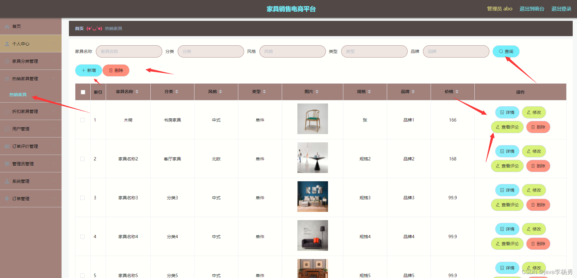 家具详情:管理员通过列表可以获取家具名称、分类、风格、类型、图片、规格、品牌、价格等信息,并进行详情、删除、修改操作,如图所示。