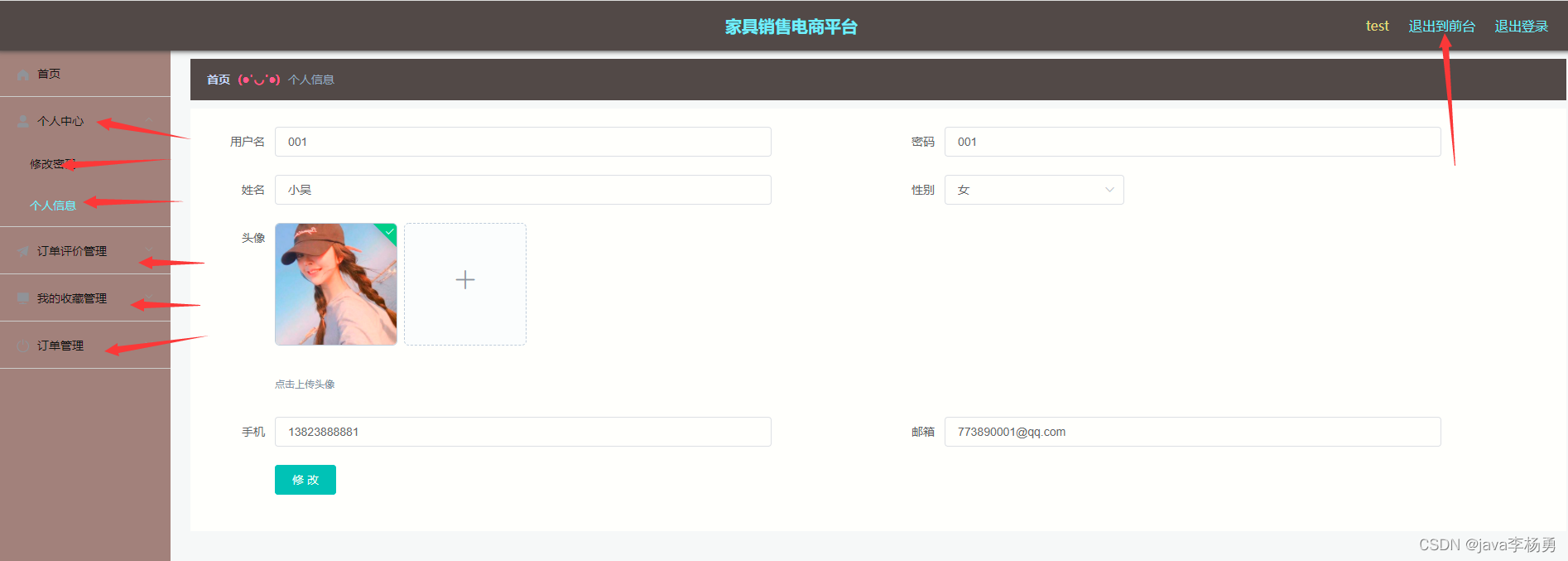 个人中心模块:在个人中心可以查看修改个人信息、查看订单信息以及收货地址和收藏等模块的管理查看操作。