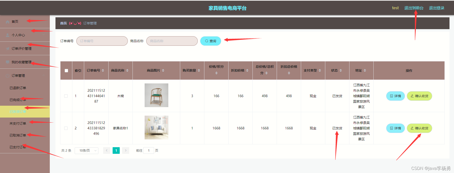 2、管理员;首页、个人中心、家具分类管理、热销家具管理、折扣家具管理、用户管理、订单评价管理、管理员管理、系统管理、订单管理等。