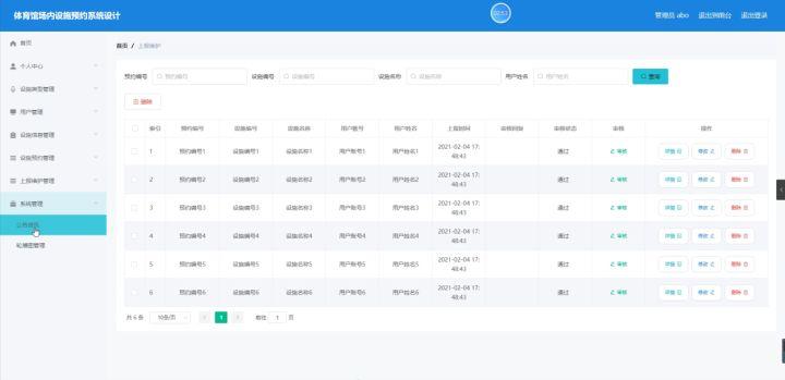 上报维护管理,在上报维护管理页面可以查看索引、预约编号、设施编号、设施名称、用户账号、用户姓名、上报时间、审核回复、审核状态、审核等信息,并可根据需要进行修改操作,如图5- 12所示。