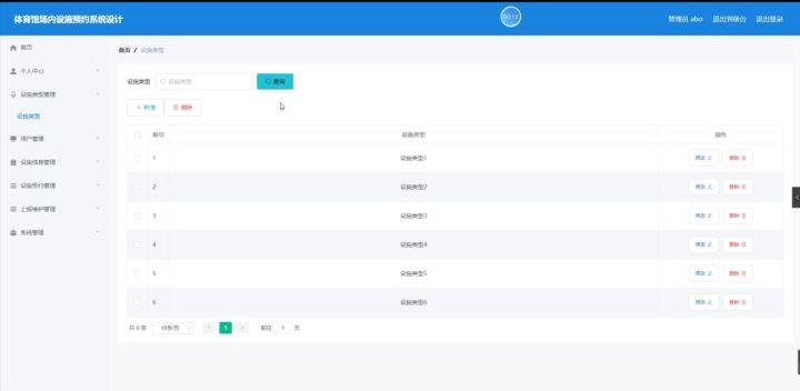 管理员登录进入体育馆场内设施预约系统设计可以查看首页、个人中心、设施类型管理、用户管理、设施信息管理、设施预约管理、上报维护管理、系统管理等内容,如图5-7所示。