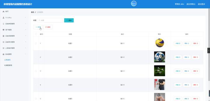 本系统设计的是一个体育馆场内设施预约的网站,此网站使用户实现了不需出门就可以在电脑前进行网上查看首页、设施信息、公告资讯、个人中心、后台管理等。不需亲临现场就可以查看在网站的信息。