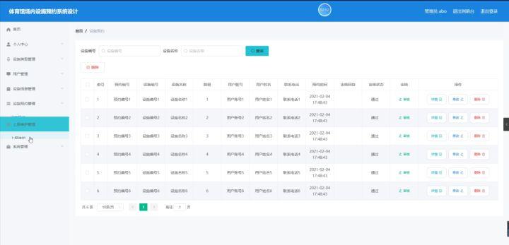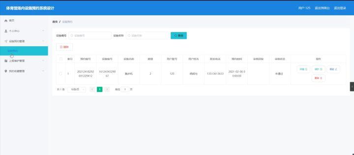 设施预约管理,在设施预约管理页面可以查看索引、预约编号、设施编号、设施名称、数量、用户账号、用户姓名、联系电话、预约时间、审核回复、审核状态、审核等信息,并可根据需要进行修改或删除等操作,如图5-11所示。