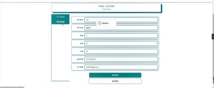 个人中心,在个人中心页面通过填写用户账号、用户姓名、密码、性别、年龄、联系电话、电子邮箱等信息更新信息,还可对我的收藏做出相对应操作,如图5-5所示。