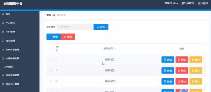 管理员房间类型管理:通过房间类型管理列表可以获取索引、房间类型、操作等信息,进行详情、修改或删除操作,如图。