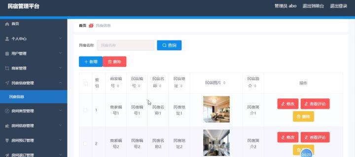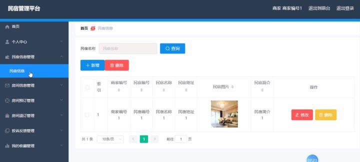 管理员民宿信息管理:通过民宿信息管理列表可以获取商家编号、民宿编号、民宿名称、民宿地址、民宿图片、民宿简介等信息,进行修改或删除操作,如图5-8所示。