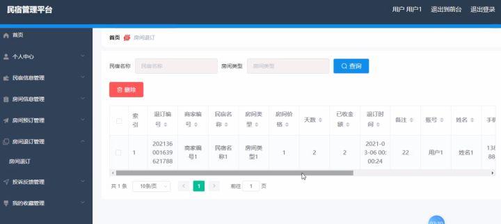 商家用户可以实现首页、个人中心、民宿信息管理、房间信息管理、房间预订管理、房间退订管理、投诉反馈管理、我的收藏管理等。