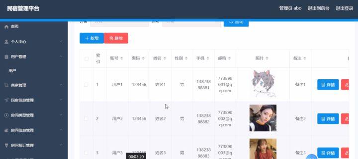 房间预订管理:通过房间预订管理列表可以获取预定编号、商家编号、民宿名称、房间类型、房间价格、天数、已收金额、预订时间、入住时间、备注、账号、姓名、手机、是否支付等信息,进行详情、修改、删除等操作,如图5-3所示。