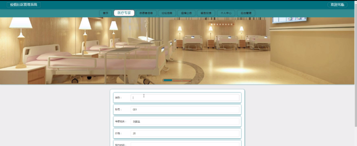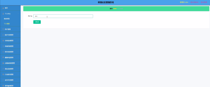 用户登录进入疫情社区管理系统可以查看首页、个人中心、专家咨询管理、咨询回复管理、预约信息管理、健康档案管理、报名信息管理、行动报告管理、