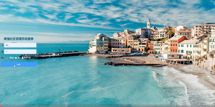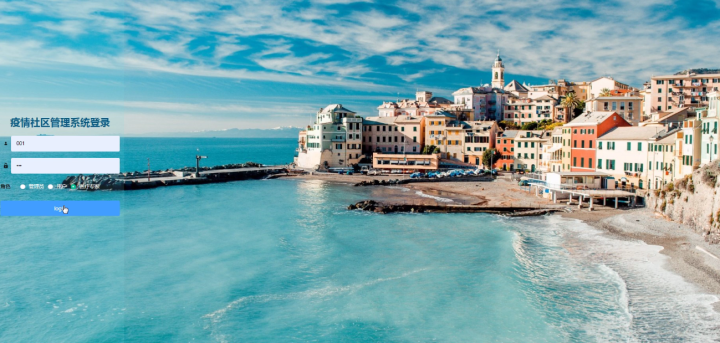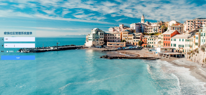 用户登录,用户通过输入用户名,密码,角色等信息进入疫情社区管理系统,如图5-13所示。