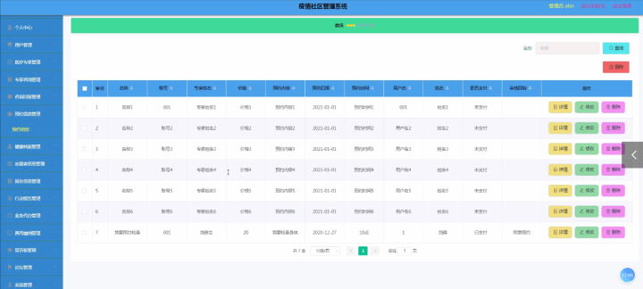 系统管理也都将通过计算机进行整体智能化操作,对于疫情社区管理系统信息管理所牵扯的信息管理及数据保存都是非常多的,举例像所有的管理员;首页、个人中心,用户管理、医疗专家管理、专家咨询管理、咨询回复管理、预约信息管理、健康档案管理、志愿者信息管理、报名信息管理、行动报告管理、业务代办管理、费用缴纳管理、留言板管理、论坛管理、系统管理,等等,这给管理者的工作带来了巨大的挑战,所以为此开发了本疫情社区管理系统,为用户提供疫情社区管理系统平台,方便管理员及时高效的管理所有的信息,给用户提供简单方便快捷的方式,并且数据准确,用户可以足不出户就可以对疫情社区管理系统相关信息进行管理,统计查询等操作,而且还能节省用户查询信息的等待时间,所以开发疫情社区管理系统给工作人员带来很大的方便,可以大大的提高系统人员工作效率。