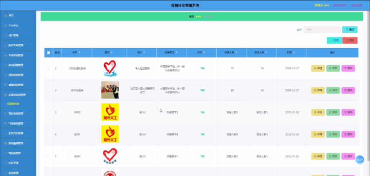 志愿者信息管理,在志愿者信息管理页面可以查看名称、图片、简介、招募要求、文件、招募人数、报名人数、日期等内容,并可根据需要对志愿者信息管理进行修改,删除或查看详细内容等操作,如图5-8所示。