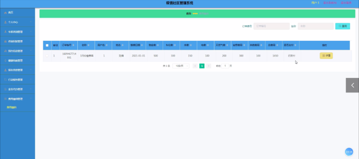 费用缴纳管理,在费用缴纳管理页面可以通过填写订单编号、名称、用户名、姓名、缴费日期、物业费、车位费、水费、电费等内容进行查看、详情如图5-18所示