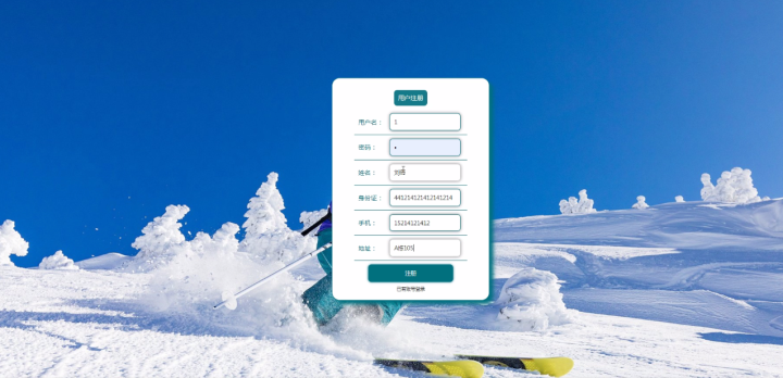 登录、用户注册,在用户注册页面可以填写用户名、密码、姓名、身份证、手机、地址等进行用户注册,如图5-2所示。
