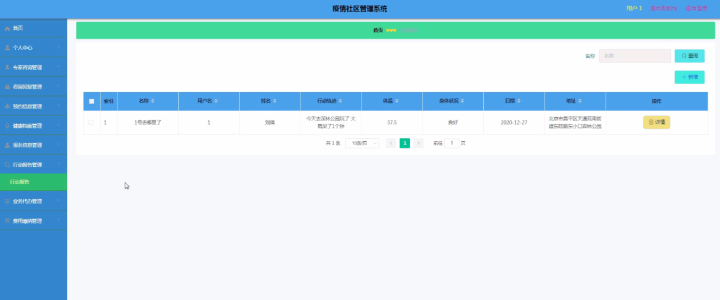 行动报告管理,在行动报告管理页面可以查看名称、用户名、姓名、行动轨迹、体温、身体状况等内容,并可根据需要进行修改,删除或查看详细内容等操作,如图5-12所示。