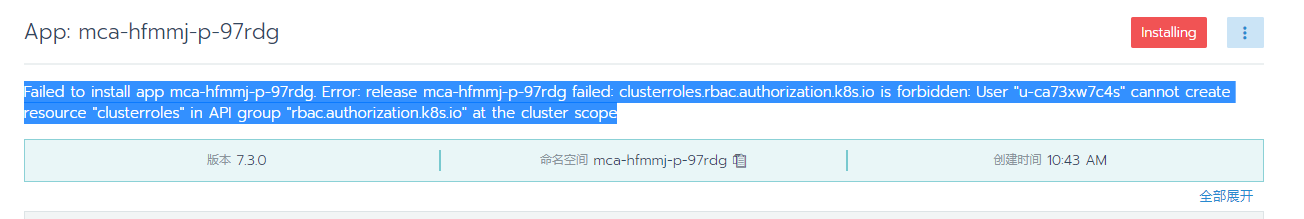 Failed to install app mca-hfmmj-p-97rdg. Error: release mca-hfmmj-p-97rdg failed: clusterroles.rbac.authorization.k8s.io is forbidden: User "u-ca73xw7c4s" cannot create resource "clusterroles" in API group "rbac.authorization.k8s.io" at the cluster scope