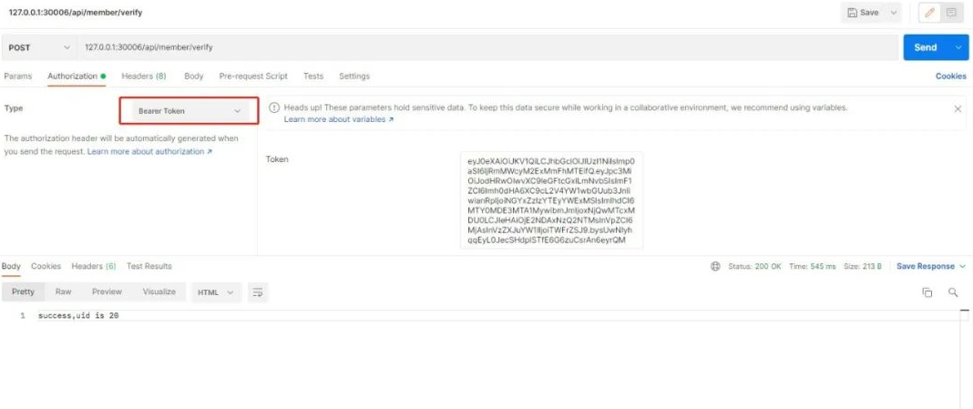 验证令牌验证这个Token是不是合法的,有没有过期等,并可以解析出subject和claim里面的数据,传递jwt token的方式为Authorization中的Bearer Token,如下