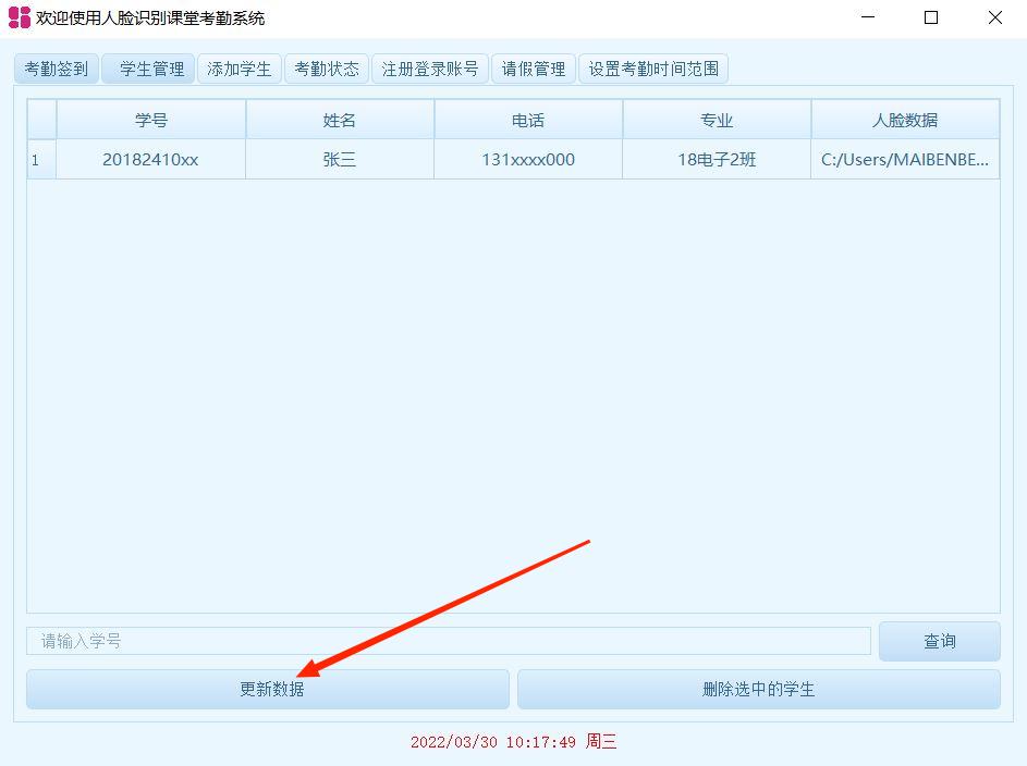 软件主要是应用在高校给学生进行考勤、签到处理,所有在功能上需要健全,支持人脸签到,支持输入学号签到,支持添加学生,支持删除学生;在界面上也支持请假管理,需要请假的学生在界面上录入请假事由,方便上课老师了解该学生的详细情况;在录入学生信息的同时,输入了学生的学号、电话、姓名、专业等信息,在学生迟到没有上课的时候,老师可以通过电话进行联系,了解情况。以前高校考勤都是老师点名实现记录的,这样比较浪费课堂时间,有了这套支持人脸识别的系统,学生路过的时候就直接进行考勤签到,非常方便,也不需要学生进行拿笔进行纸质签到,提高了整体的课堂效率。