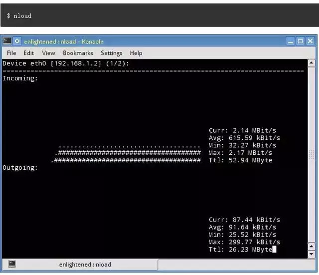 nload是一个命令行工具,让用户可以分开来监控入站流量和出站流量。它还可以绘制图表以显示入站流量和出站流量,视图比例可以调整。用起来很简单,不支持许多选项。
