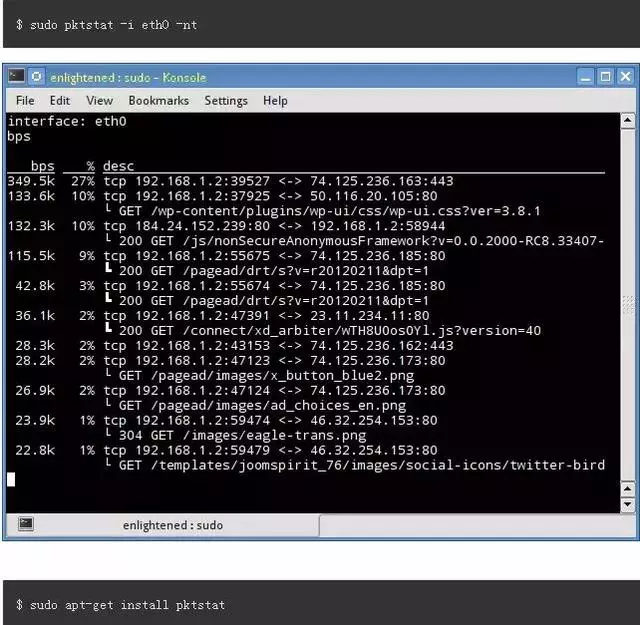 pktstat可以实时显示所有活动连接,并显示哪些数据通过这些活动连接传输的速度。它还可以显示连接类型,比如TCP连接或UDP连接;如果涉及HTTP连接,还会显示关于HTTP请求的详细信息。