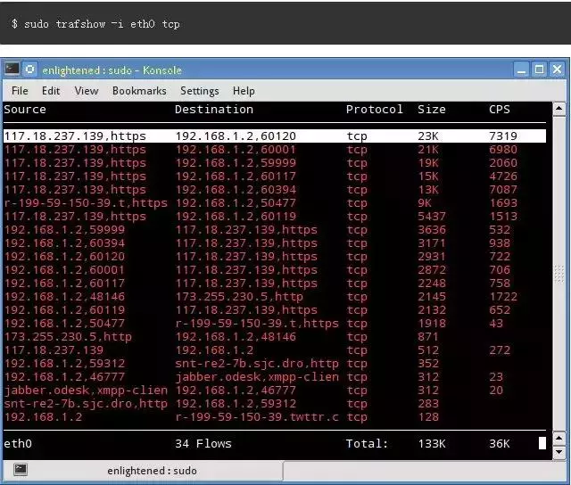与netwatch和pktstat一样,trafshow也可以报告当前活动连接、它们使用的协议以及每条连接上的数据传输速度。它能使用pcap类型过滤器,对连接进行过滤。