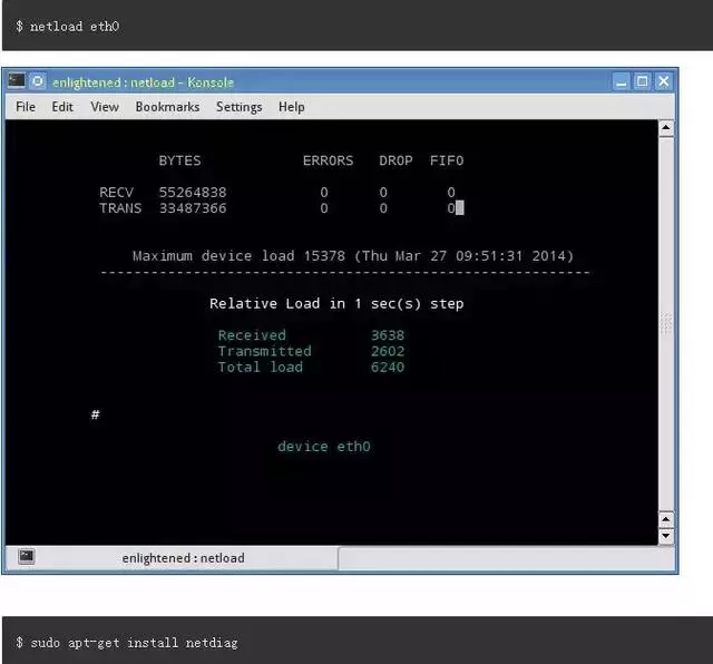 netload命令只显示关于当前流量负载的一份简短报告,并显示自程序启动以来所传输的总字节量。没有更多的功能特性。它是netdiag的一部分。
