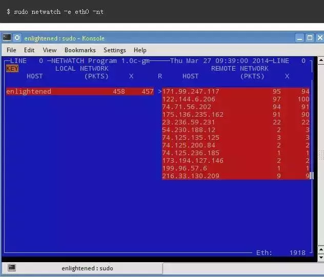 netwatch是netdiag工具库的一部分,它也可以显示本地主机与其他远程主机之间的连接,并显示哪些数据在每个连接上所传输的速度。