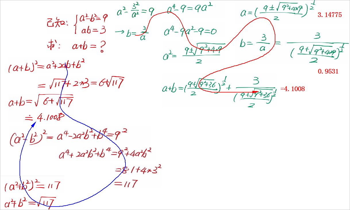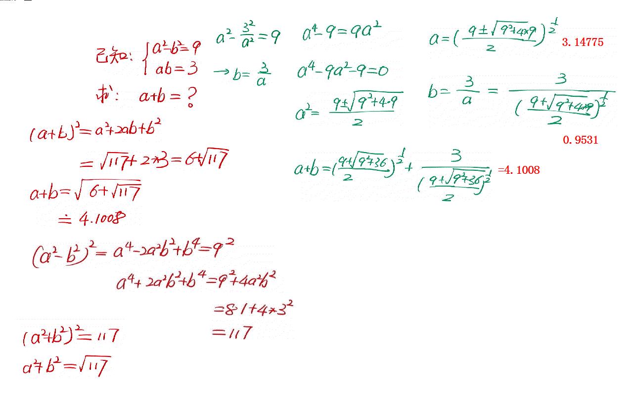 下面就是另外一种求解方法。 为了求a+b的值, 先看看是否可以求得(a+b)的平方取值? 展开a+b的平方,可以看到其中包含三项, 中间的ab乘积是已知的, 但a平方+b平方需要求的。