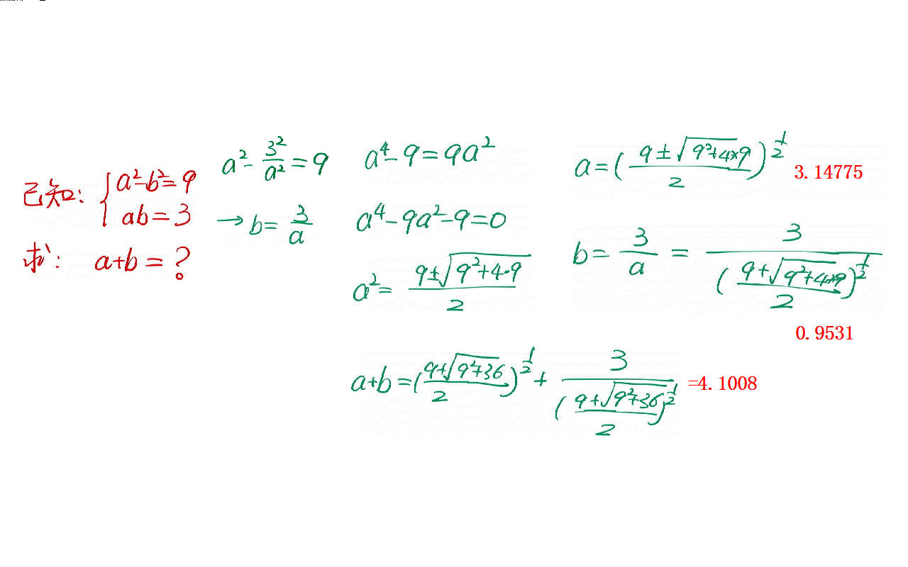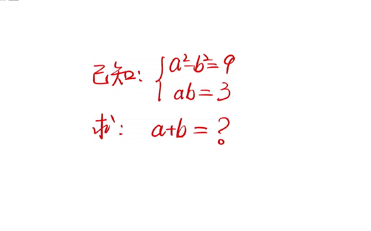 已知变量a,b平方的差与a,b的乘积, 求a+b的值。学过数学的人的直接冲动,就是根据ab=3, 得到b=3/a。带到第一个表达式 可以列出关于a的方程。 求解这个方程。 便可以得到a平方的取值 根据a平方大于0, 便可以得到a的唯一取值, 这个取值看弃疗比较复杂。 不过这是求出的a的取值。