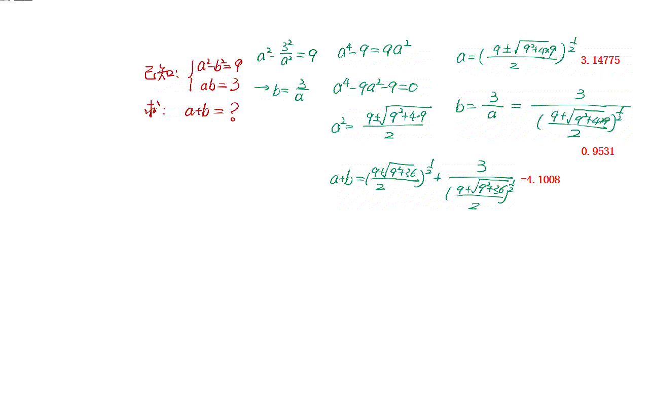下面再根据b=3/a, 可以知道b的取值, 最终获得a+b的取值。 化简这个表达式简直就是一个噩梦。 这里给出了a,b,a+b的数值求解。