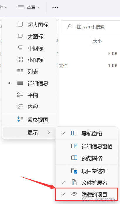 4.该目录下会生成.ssh文件,若没有则需要开启显示“隐藏的项目”如下: