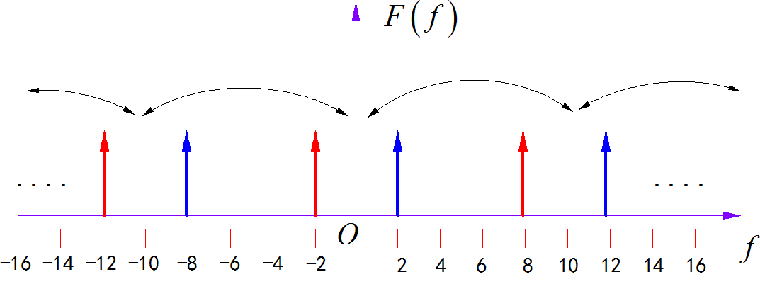 在周期延拓后的频谱中,可以看到 在 ±8Hz 处存在表示 8Hz 正弦信号的两个谱线。 特别是,这个 8Hz 的谱线是左蓝右红, 与原来 2Hz的谱线的左右恰好相反,说明它对应的频率为负数,对应空间转动方向与原来 2Hz 空间转动方向相反。