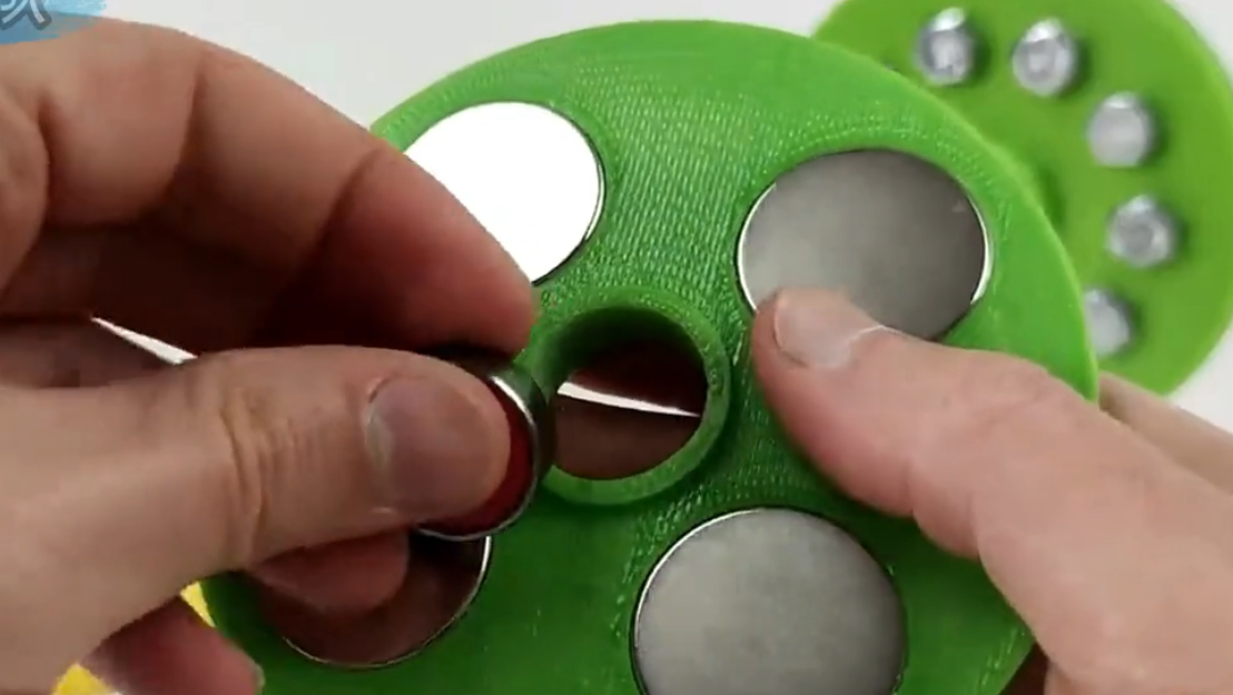 一个小小塑料玩具会让人感到非常的神奇,它由三个圆盘组成。其中一个圆盘被均匀嵌入了16个小号的圆形磁铁,它们的磁极极性相互错开。