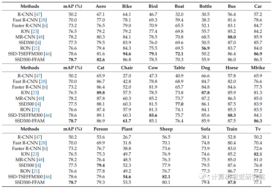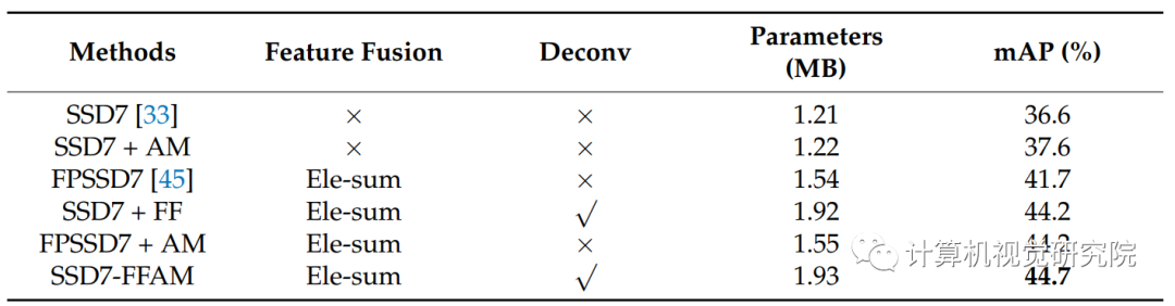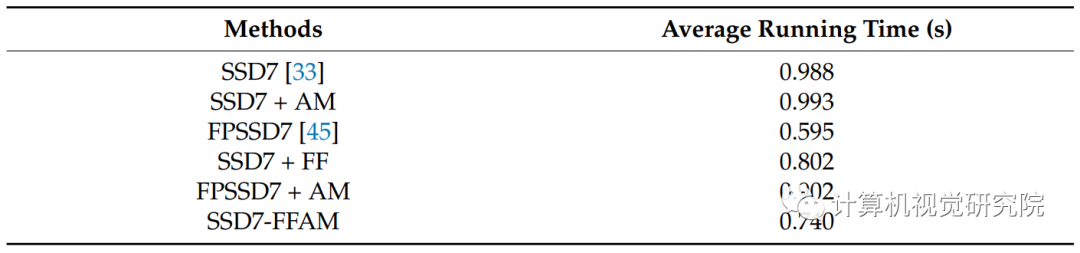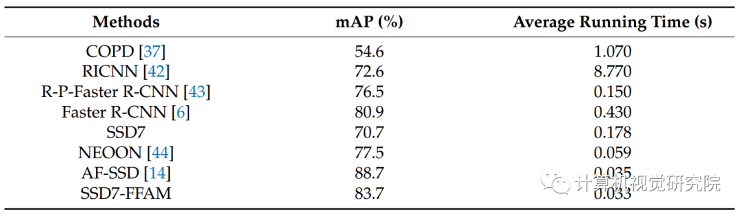 在NWPU VHR-10数据集上,SSD7-FFAM实现了83.7%的mAP、1.66MB参数和0.033s的平均运行时间。结果表明,该SSD7-FFAM更适合于部署到嵌入式设备上进行实时目标检测。