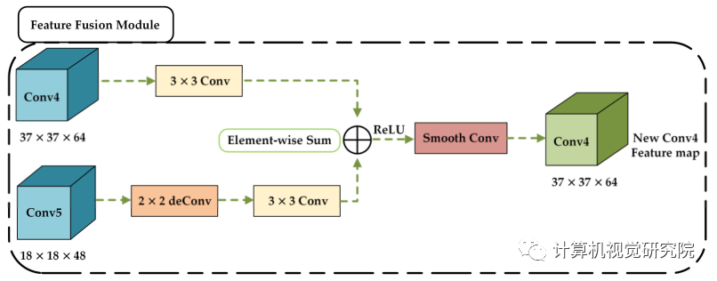 上图显示了SSD7-FFAM中使用的特征融合模块结构示例。新的Conv4特征图与其他两个特征图一起传递到注意模块。