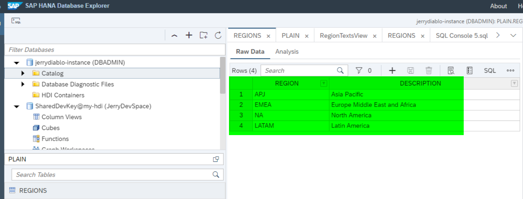 Node.js 代码里打印的数据库表 REGIONS,来自 PLAIN schema: