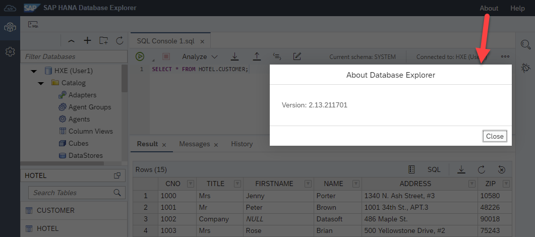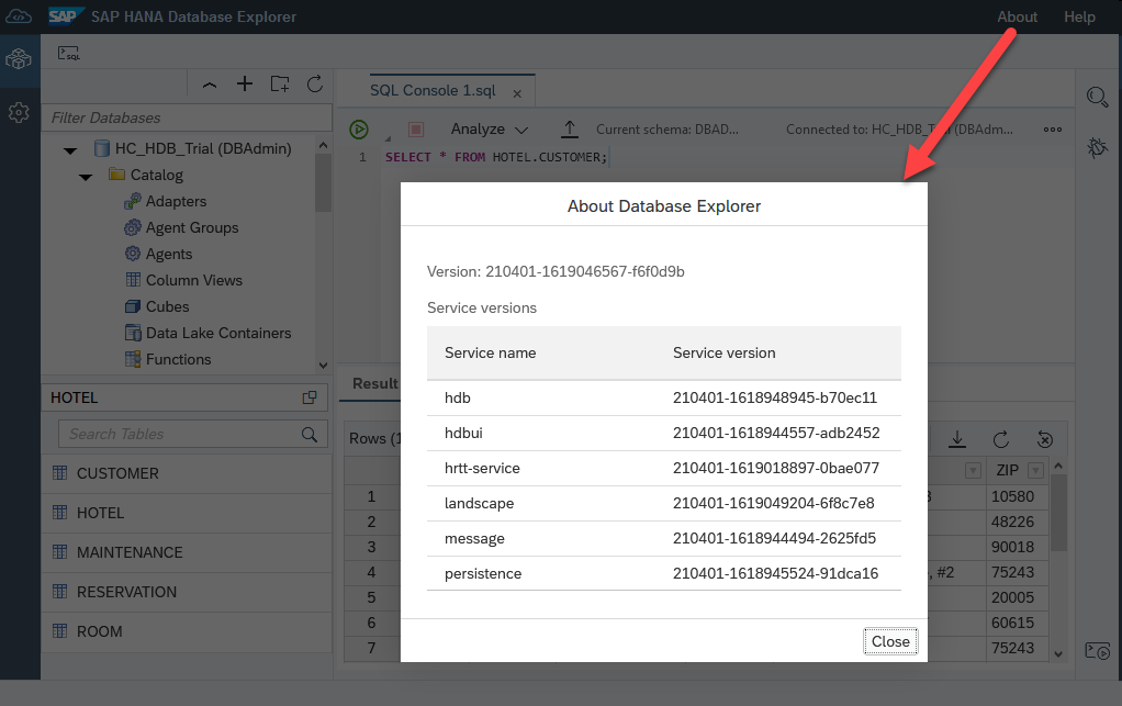 下面的屏幕截图显示了 SAP HANA Cloud 和内部部署的 SAP HANA 数据库浏览器的版本。