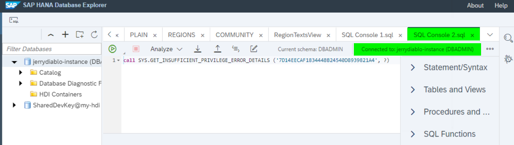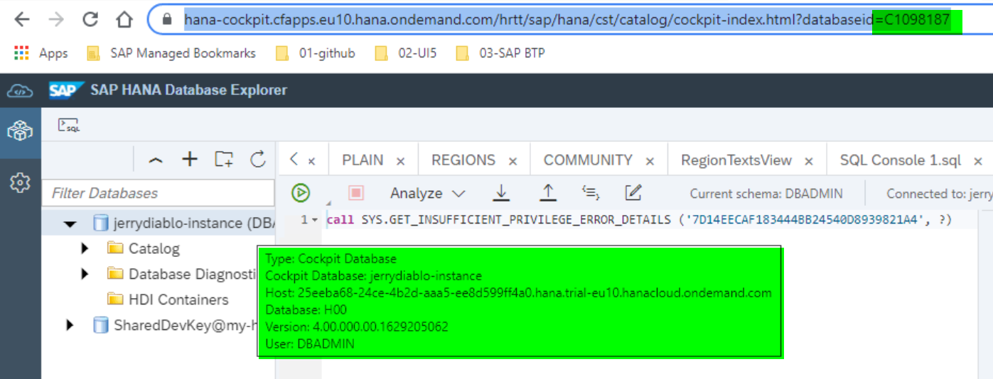 请注意,当 SAP HANA 数据库浏览器打开时,所选数据库是所选磁贴或管理数据库中的数据库。 另请注意,该 URL 包含一个 ?databaseid=。