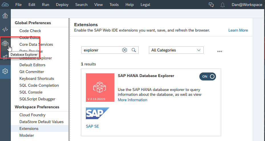 下图显示了在本地安装中运行的 SAP HANA 数据库浏览器。
