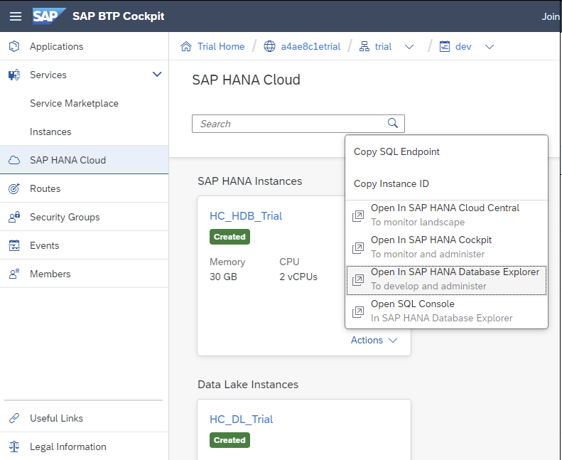 (1) 来自 SAP HANA 或 Data Lake 实例的 SAP 业务技术平台 (SAP BTP) Cockpit。