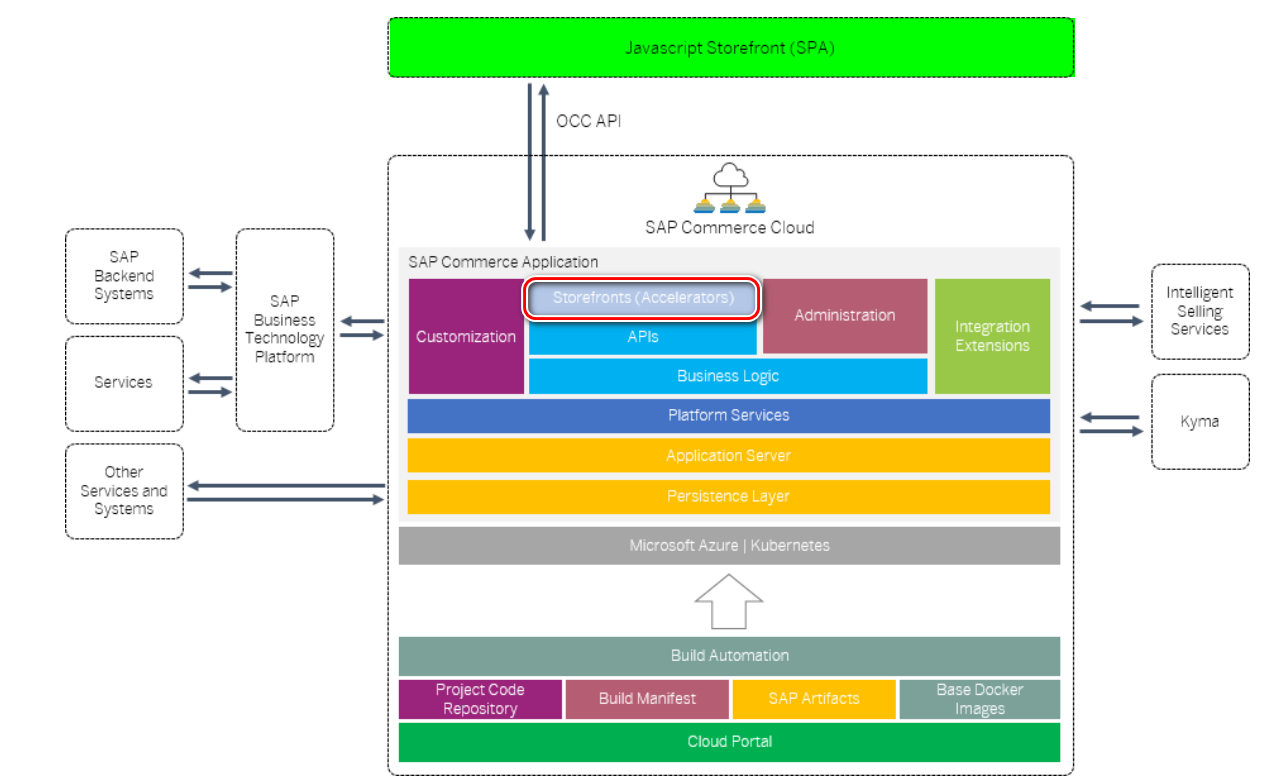 下图是来自 SAP Commerce Cloud 帮助文档里的架构图:其中最上层绿色矩形框,就是 Commerce Cloud 的前台页面,这是一个单页面应用 Single Page Application,基于 Angular 前端框架开发。同时 Commerce Cloud 也自带一个基于传统 JSP 技术的前台界面,即下图红色矩形框里的 Accelerator Storefront.