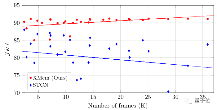 在处理长视频时,随着帧数的增加,XMem的性能也没有下降。