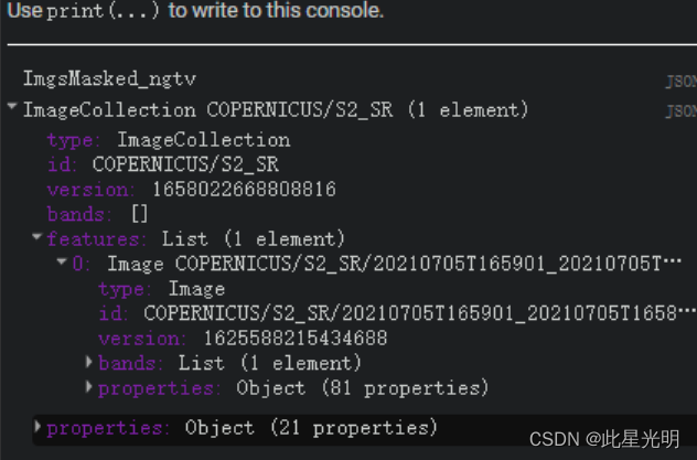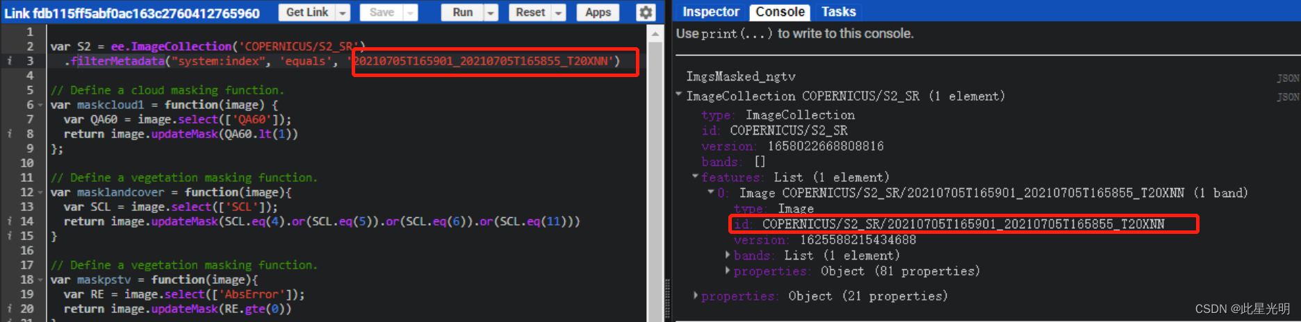 这里有一个问题,是单单只有一景影像, 但是这里我们需要看代码,代码中利用的函数就是原数据筛选,然后 就是这个函数用的等于,等于的值是单景影像的id