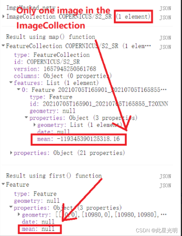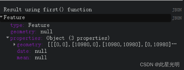 这里第二个问题就是我们这里再统计单景影像的函数的时候这里是将统计值返回给一个空的矢量,所以这里并没有将其统计的值给得到,而这里选择的是first,也就是选择的第一个shp矢量这里本身就是一个空值