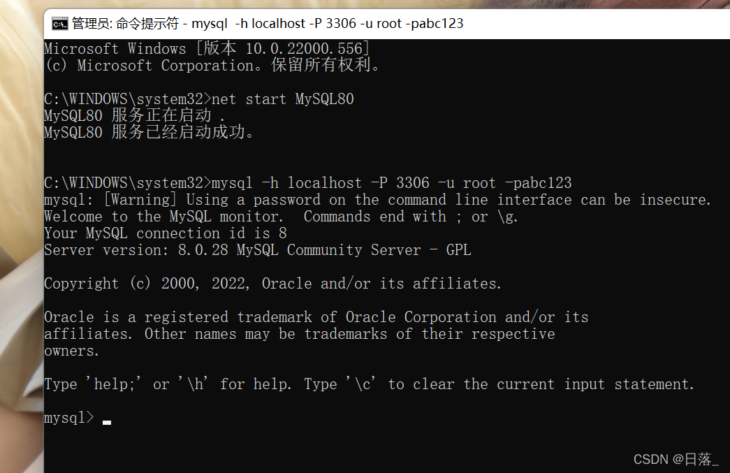 (3)客户端和服务器在同一台机器上,所以输入localhost或者IP地址127.0.0.1。同时,因为是连接本机: -hlocalhost就可以省略,如果端口号没有修改:-P3306也可以省略。